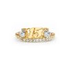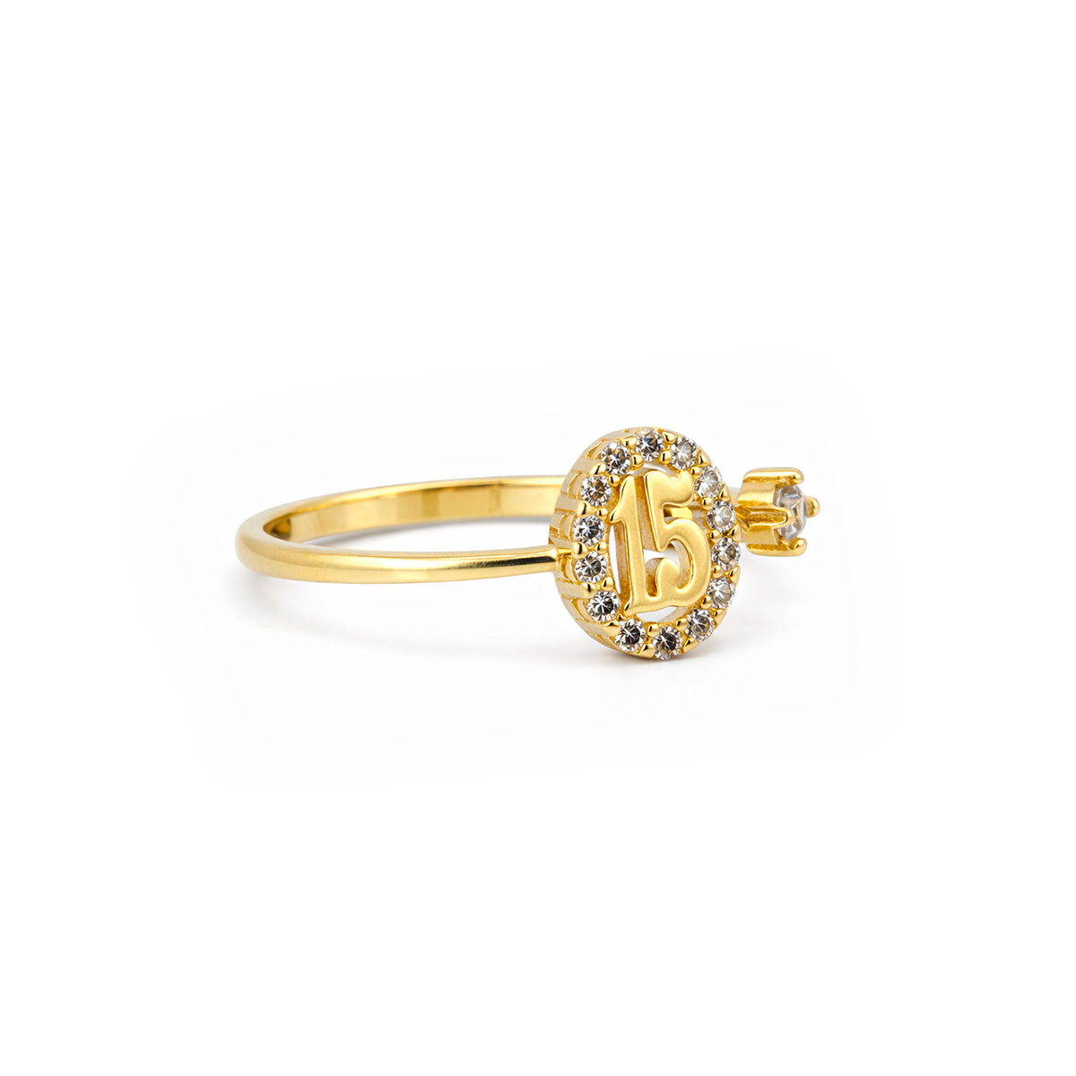 Anillo de 15 años en oro 10K con diseño ovalado, zirconias brillantes y detalle lateral de 1.4 g, elegante y juvenil.