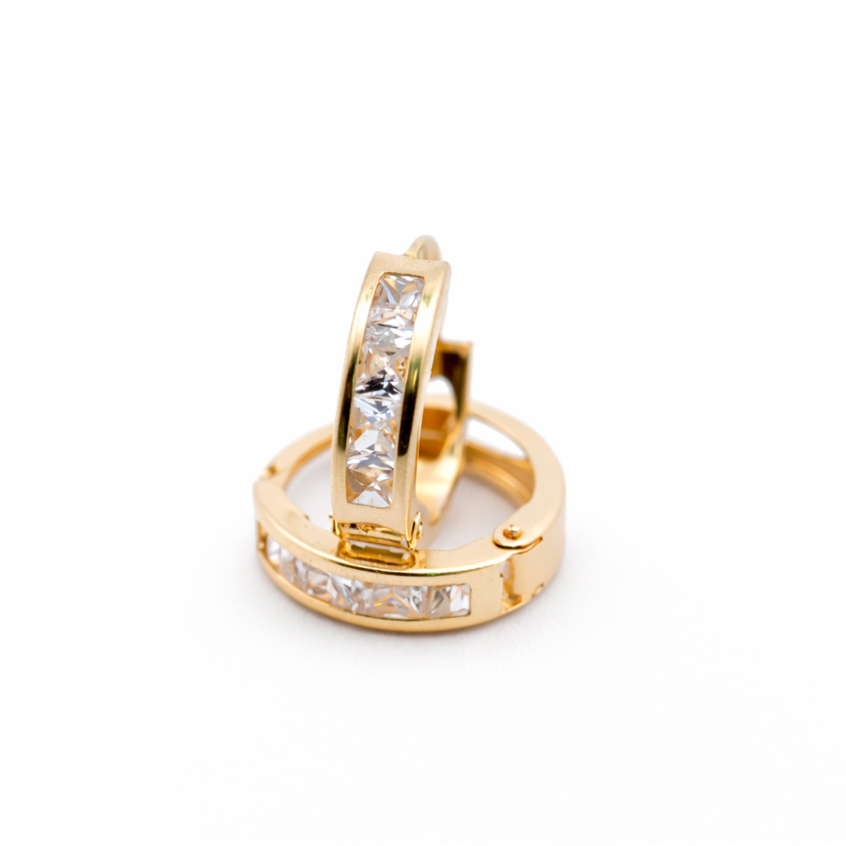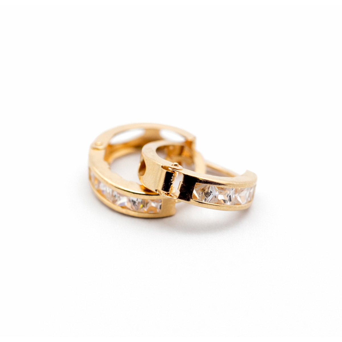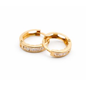 Material: Oro 10KPiedra: Zirconias blancasDiámetro: 1.3 cmPeso aproximado: 1.4 gramosCierre: Tipo click seguroAcabado: Pulido brillante