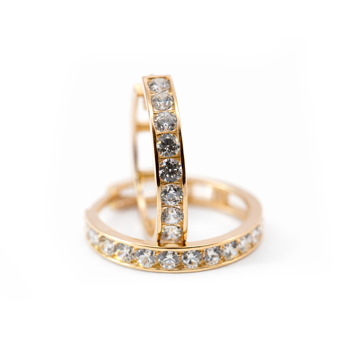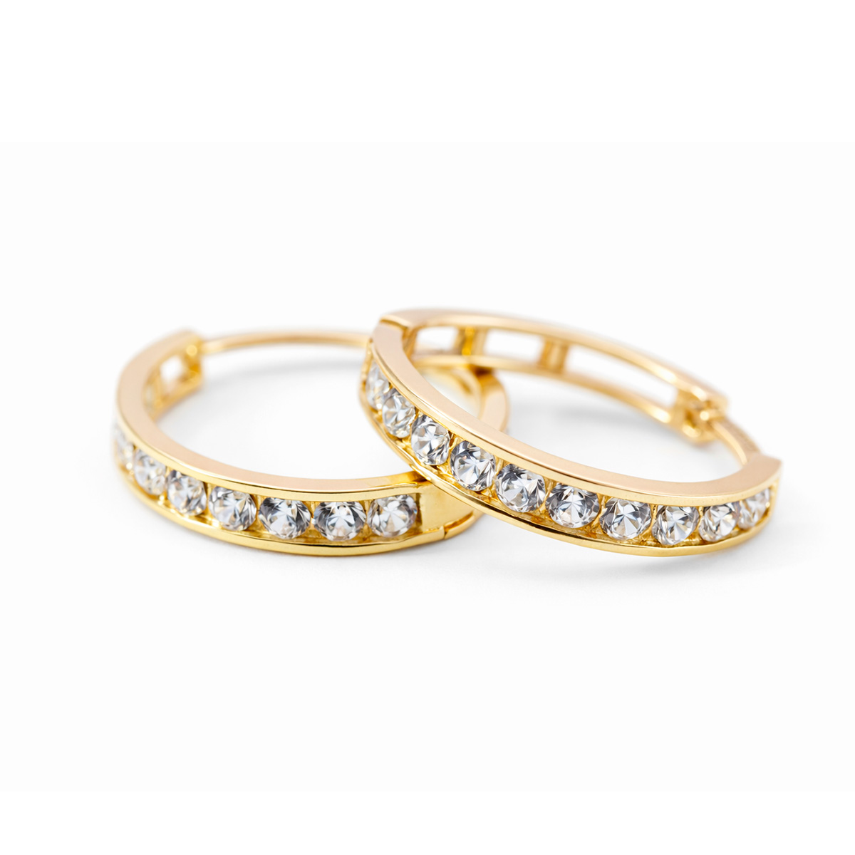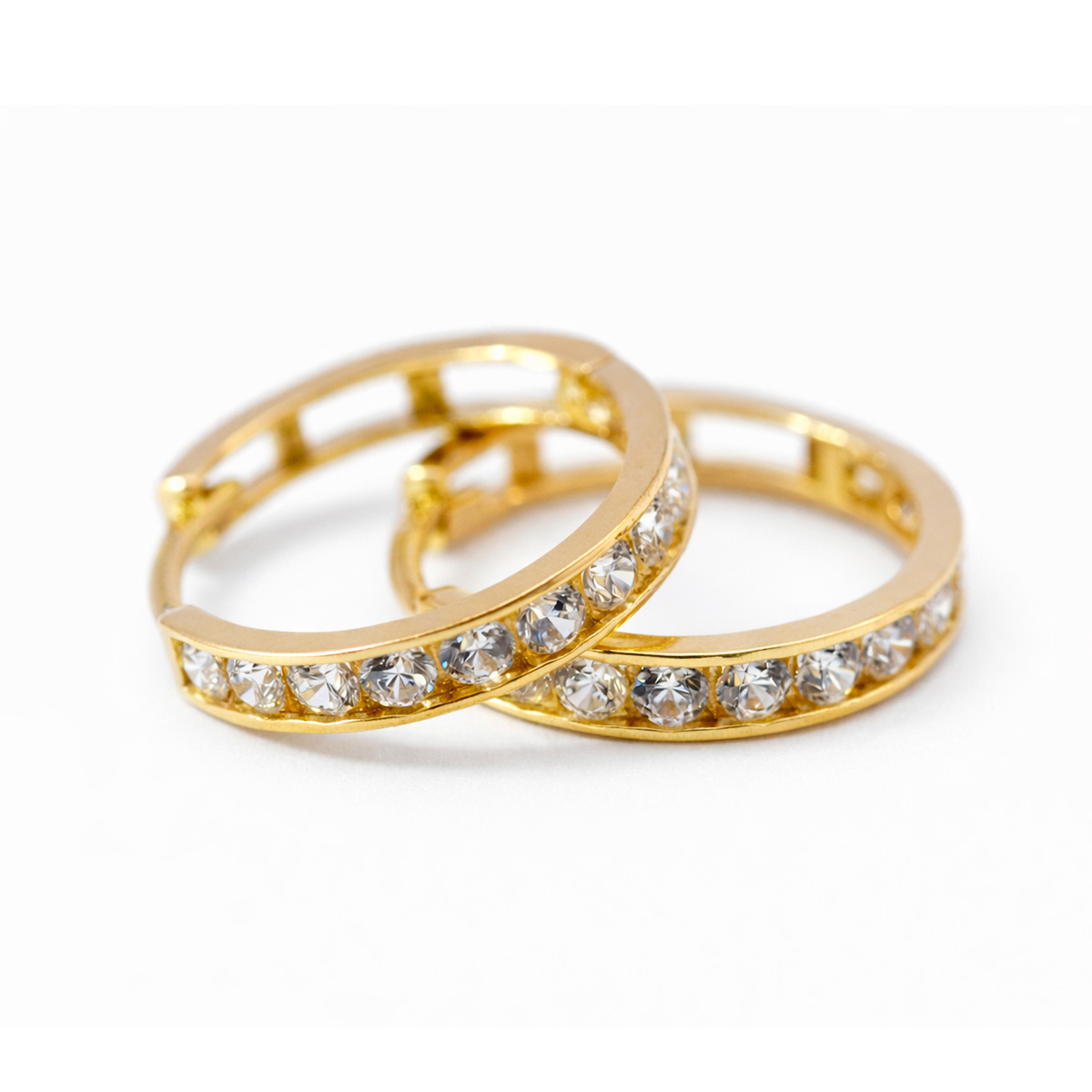 Material: Oro 10KPiedra: Zirconias blancasDiámetro: 2 cmPeso aproximado: 3 gramosCierre: Tipo click seguro