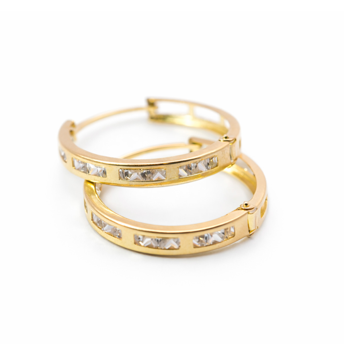 Material: Oro 10KPiedra: Zirconias blancasDiámetro: 2 cmPeso aproximado: 2 gramosCierre: Tipo click seguro