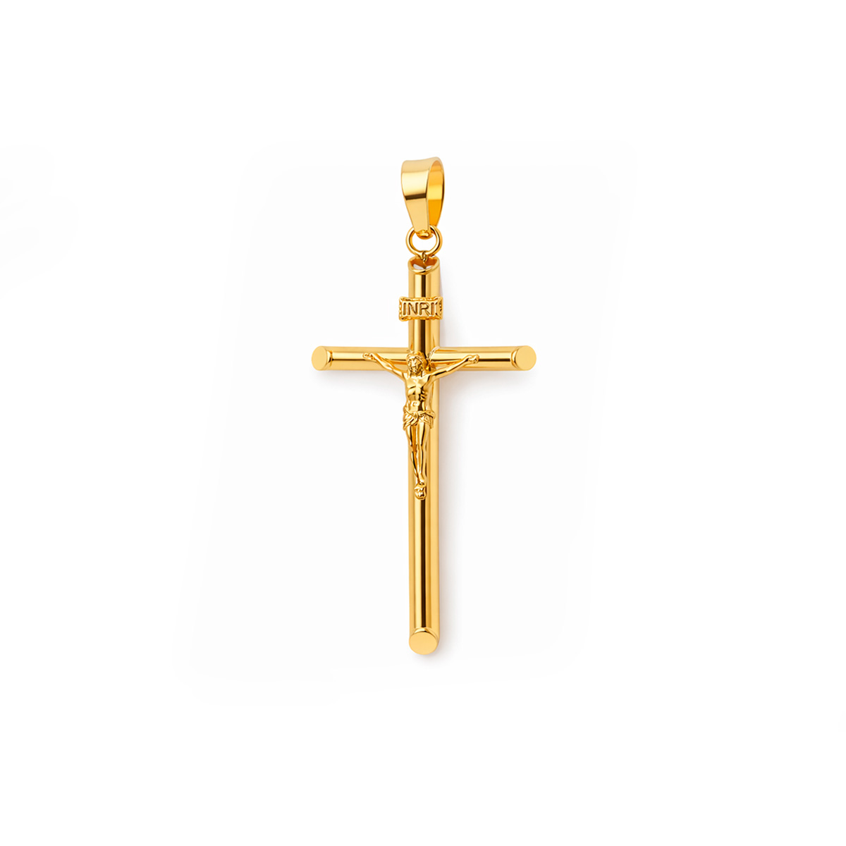 Crucifijo clásico en Oro 10K con Cristo y acabado brillante de mayor tamaño.