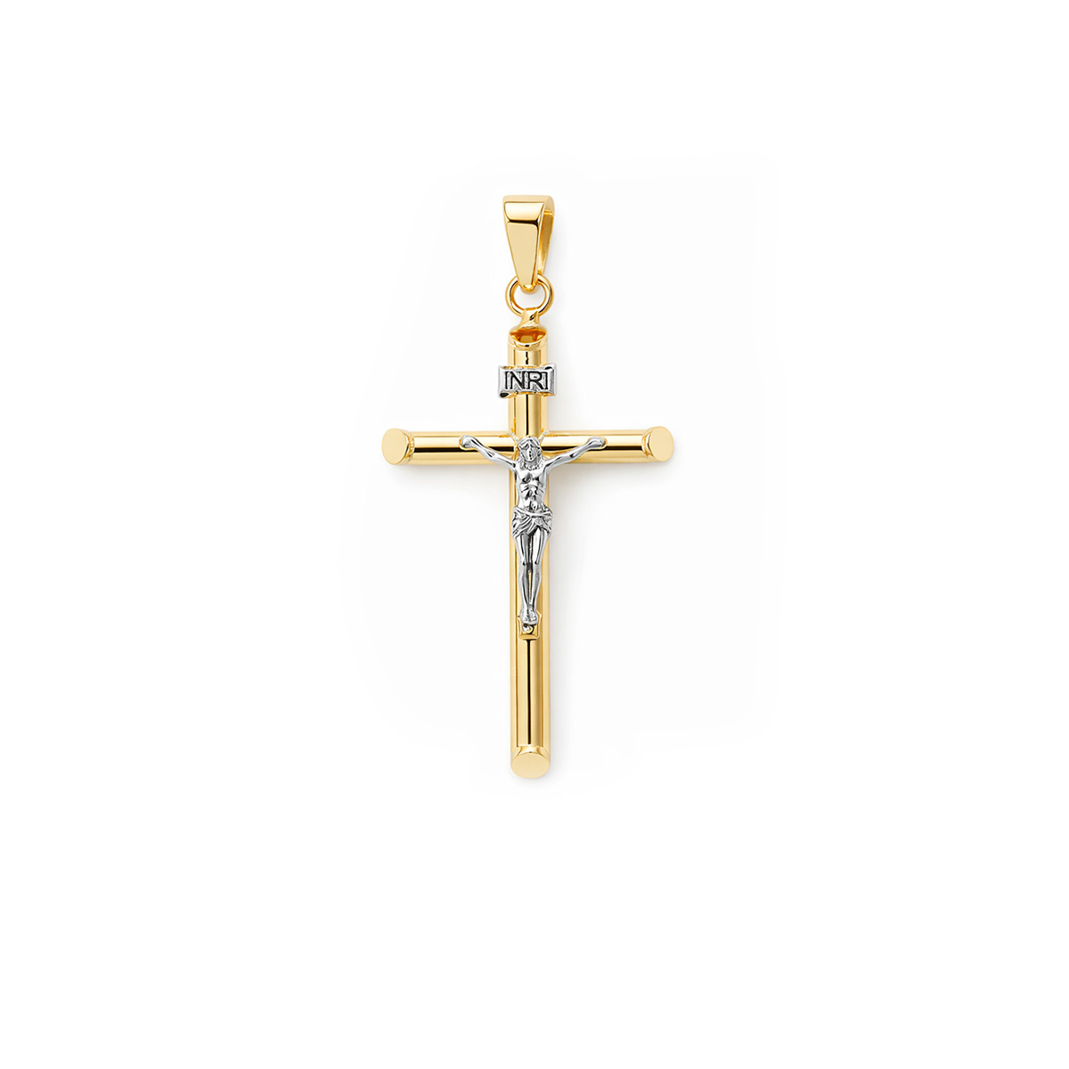 Crucifijo bicolor en Oro 10K con Cristo en oro blanco y acabado brillante.