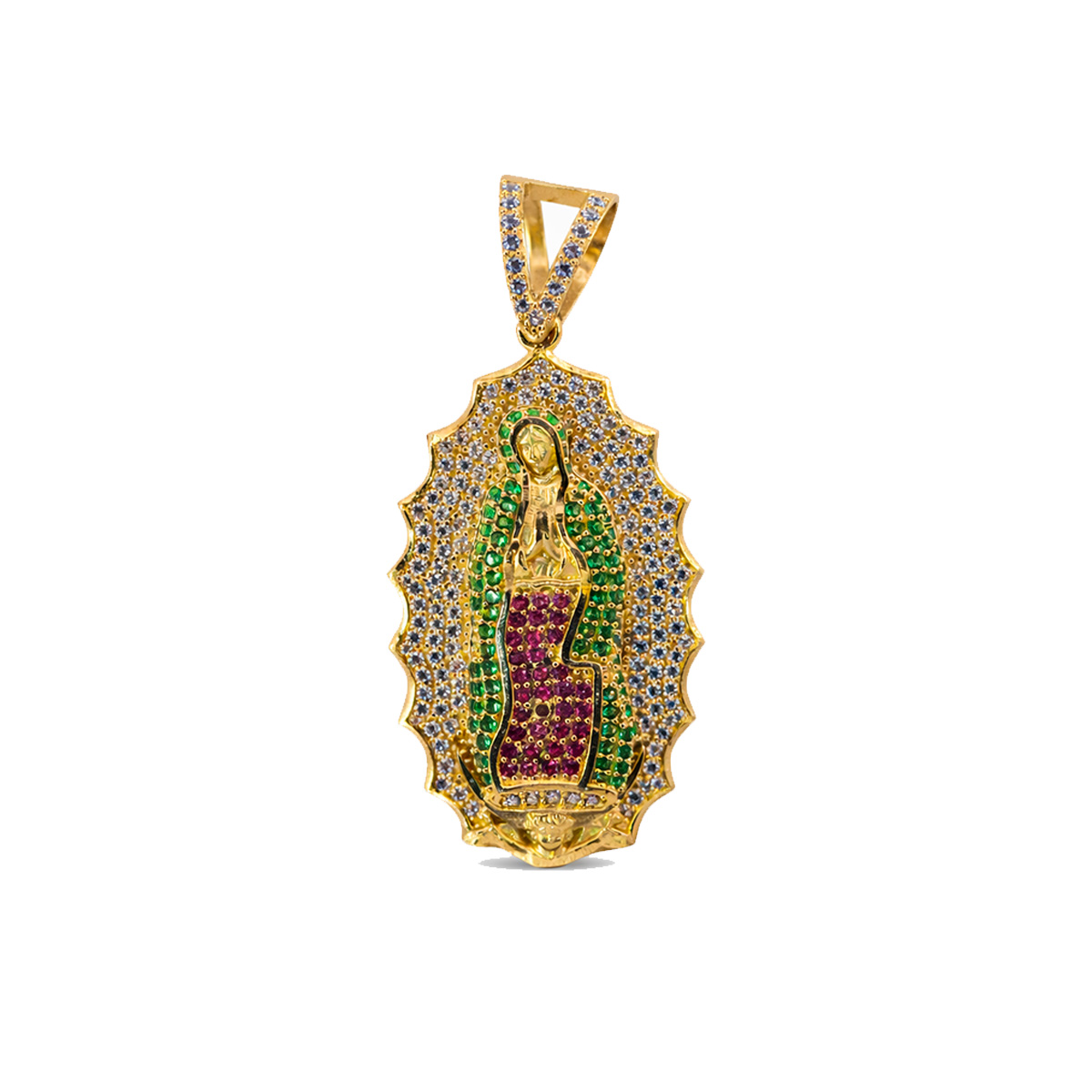Oro 10K con diseño detallado de la Virgen y zirconias multicolor en acabado brillante.
